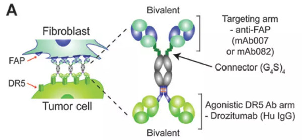 Inhibrx首個(gè)嘗試為四價(jià)納米抗體DR5抗體INBRX-109。羅氏也曾嘗試基于Fab串聯(lián)的OX40四價(jià)抗體,不過其激動(dòng)劑抗體研發(fā)已經(jīng)轉(zhuǎn)向FAP/TAA保證安全性,并依賴于FAP的結(jié)合介導(dǎo)受體的寡聚化,如FAP/DR5雙抗RG7386。
