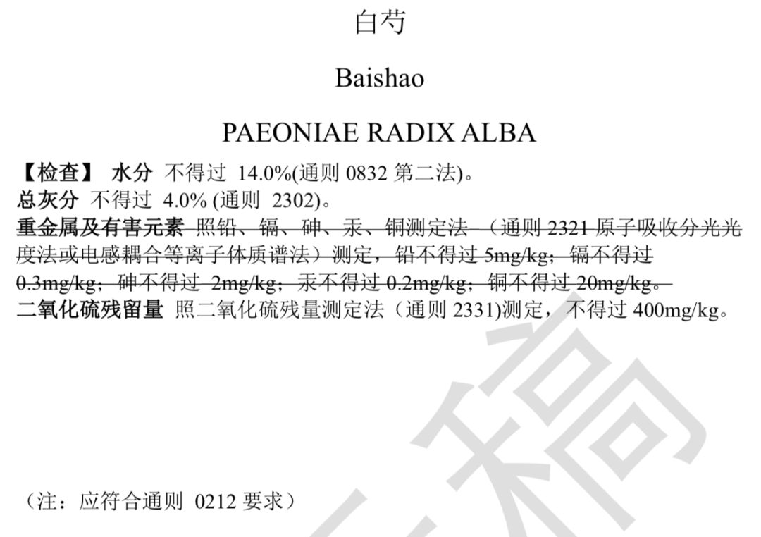 提示:下面劃線刪除重金屬及有害元素,并不是不要做哦,而是因為通則已有要求,所以各品種就不需再單列了。
