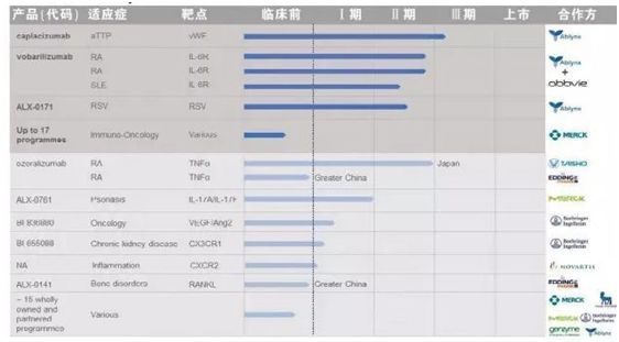 Ablynx擁有多達(dá)40多個(gè)候選藥物,應(yīng)用于癌癥、自身免疫病、呼吸系統(tǒng)疾病、血液系統(tǒng)疾病等多個(gè)不同領(lǐng)域。Ablynx在納米抗體領(lǐng)域擁有絕對(duì)的領(lǐng)導(dǎo)地位,截止2017年9月,已累計(jì)與輝瑞、禮來、諾華、勃林格殷格翰、賽諾菲等國際藥企達(dá)成超過70億歐元的合作。