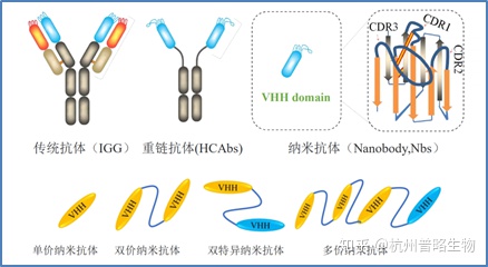 納米抗體最早由比利時(shí)科學(xué)家于1993年在《Nature》雜志中首次報(bào)道,是駱駝科動(dòng)物(駱駝、大羊駝、羊駝及其近親物種)缺失輕鏈的天然重鏈抗體的可變區(qū)組成的單域抗體,該抗體只包含一個(gè)重鏈可變區(qū)(VHH)和兩個(gè)常規(guī)的CH2與CH3區(qū),VHH晶體為2.5nm,長4nm,分子量只有15KD,因此被稱作納米抗體。