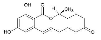 玉米赤霉烯酮(zearalenone,ZEN)又稱F-2毒素,是一種由禾谷鐮刀真菌(graminearum)、黃色鐮刀真菌(culmorum)以及克地鐮刀真菌(crookwellense)等多種鐮刀霉菌產(chǎn)生并釋放到土壤環(huán)境中的真菌類毒素。ZEN的化學結(jié)構(gòu)由Urry在1966年用核磁共振、經(jīng)典化學和質(zhì)譜等技術(shù)確定,并被命名為:6-(10-羥基-6-氧代-反式-1-十-碳烯)-β-雷鎖酸-內(nèi)酯。ZEN的相對分子質(zhì)量是318,熔點為165℃,熱穩(wěn)定性好,在120℃條件下加熱4h也不分解;ZEN有熒光特性,可用熒光檢測器檢測;ZEN在水中、S2C和CC14中不會溶解;在氫氧化鈉等堿溶液中,以及甲醇等有機溶劑中容易溶解。ZEN在世界各地的谷物及其副產(chǎn)品中污染廣泛,給種植業(yè)和養(yǎng)殖業(yè)帶來巨大損失,也對食品安全構(gòu)成嚴重威脅。ZEN的分子結(jié)構(gòu)圖示: