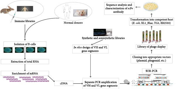 目前,由免疫文庫和通用文庫組成的幾種細胞和合成抗體文庫已被用作生成多種抗體形式的來源(圖2)。免疫文庫是從免疫動物或人類組織或血液(如骨髓、外周血單核細胞(PBMC)、脾臟、雜交瘤細胞系和任何細胞成分的樣本中產(chǎn)生的。通用庫分為天然庫、合成庫和半合成庫。天然文庫來源于未免疫供體的重組Ig V基因,具有組合性質(zhì),在文庫構(gòu)建過程中,重鏈和輕鏈隨機組合。合成文庫是利用分子生物學(xué)技術(shù)開發(fā)的,目的是增強重組抗體。半合成文庫通常來源于天然抗體和合成抗體序列的組合。